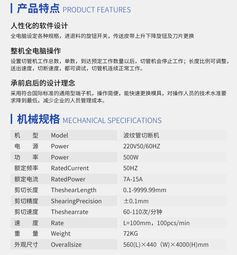 本機(jī)專(zhuān)門(mén)為汽車(chē)線束行業(yè)的波紋管開(kāi)發(fā)設(shè)計(jì),高精度PLC控制,操作簡(jiǎn)單易懂,全自動(dòng)電腦切管機(jī),可用于圓形塑料軟管,波紋管的裁切,加工效率,穩(wěn)定可靠,采用步進(jìn)電機(jī)送料,具有送料穩(wěn)定、長(zhǎng)度精確的特點(diǎn)。