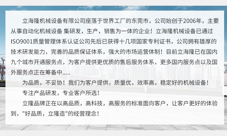 立海隆機(jī)械設(shè)備有限公司座落于世界工廠的東莞市,公司始創(chuàng)于2006年,主要從事自動(dòng)化機(jī)械設(shè)備 集研發(fā),生產(chǎn),銷(xiāo)售為一體的企業(yè)!立海隆機(jī)械設(shè)備已通過(guò)ISO9001質(zhì)量管理體系認(rèn)證。 公司先后已獲得十幾項(xiàng)國(guó)家專(zhuān)利證書(shū),公司擁有雄厚的技術(shù)研發(fā)能力,完善的品質(zhì)保證體系,強(qiáng)大的市場(chǎng)運(yùn)營(yíng)體制!目前立海隆已在國(guó)內(nèi)九個(gè)城市開(kāi)通服務(wù)點(diǎn),為客戶提供更優(yōu)質(zhì)的售后服務(wù)體系,更多國(guó)內(nèi)服務(wù)點(diǎn)以及國(guó)外服務(wù)點(diǎn)正在籌備中..... 為品質(zhì),不妥協(xié)!我們?yōu)榭蛻籼峁?,質(zhì)量?jī)?yōu),效率高,穩(wěn)定好的機(jī)械設(shè)備!專(zhuān)注產(chǎn)品研發(fā),專(zhuān)業(yè)客戶所選! 立隆品牌正在以高品質(zhì),高科技,高服務(wù)的標(biāo)準(zhǔn)面向客戶,讓客戶更好的體驗(yàn)到,"好品質(zhì),立隆造"的經(jīng)營(yíng)理念!