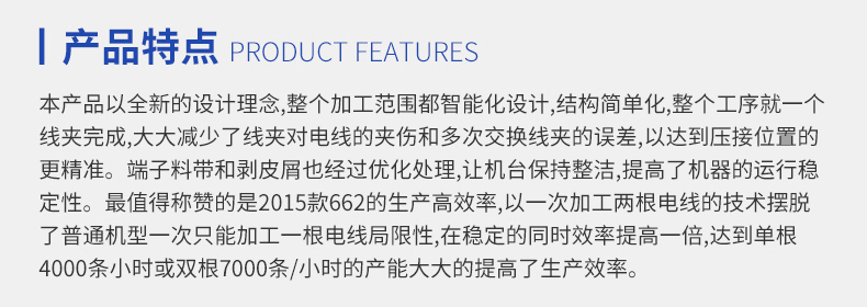 本產(chǎn)品以全新的設(shè)計(jì)理念,整個(gè)加工范圍都智能化設(shè)計(jì),結(jié)構(gòu)簡(jiǎn)單化,整個(gè)工序就一個(gè)線夾完成,大大減少了線夾對(duì)電線的夾傷和多次交換線夾的誤差,以達(dá)到接壓位置的更精準(zhǔn)。端子料帶和剝皮屑也經(jīng)過(guò)優(yōu)化處理,讓機(jī)臺(tái)保持整潔,提高了機(jī)器的運(yùn)行穩(wěn)定性。最值得稱贊的是662的生產(chǎn)高效率,以一次加工兩根電線的技術(shù)擺脫了普通機(jī)型一次只能加工一根電線局限性,在穩(wěn)定的同時(shí)效率提高一倍,達(dá)到單根4000條/小時(shí)或雙跟7000條/小時(shí)的產(chǎn)能大大的提高了生產(chǎn)效率。
