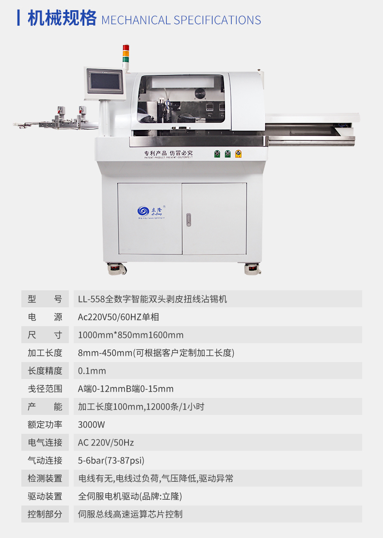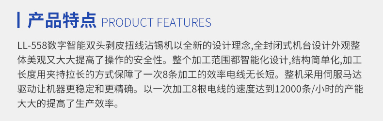 LL-558全數(shù)字智能雙頭剝皮扭線沾錫機(jī) 產(chǎn)品說明: LL-558數(shù)字智能雙頭剝皮扭線沾錫機(jī)以全新的設(shè)計(jì)理念,全封閉式機(jī)臺(tái)設(shè)計(jì)外觀整體美觀又大大提高了操作的安全性。整個(gè)加工范圍都智能化設(shè)計(jì),結(jié)構(gòu)簡單化,加工長度用夾持拉長的方式...